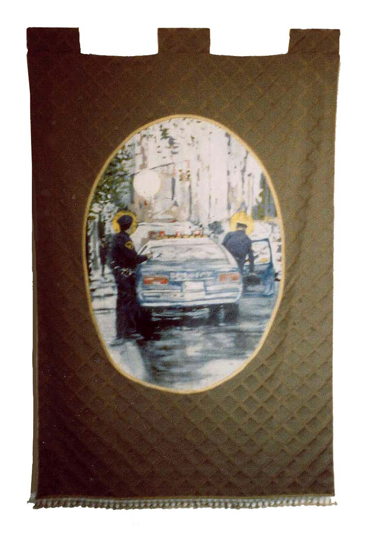 oil, enamel, dye on canvas sewn into procession flag
